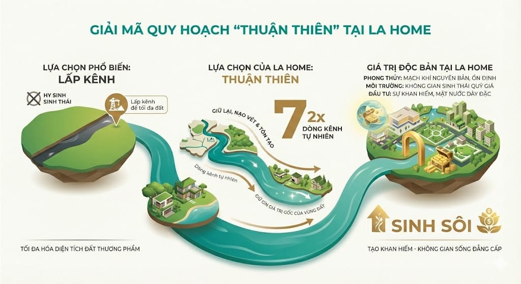 Dự án LA Home thể hiện sự khác biệt vượt trội nhờ tư duy quy hoạch thuận thiên khi quyết định giữ lại, nạo vét và tôn tạo 7 dòng kênh tự nhiên chạy dọc dự án. Trong khi đa số các dự án khác thường chọn cách lấp kênh để tối đa hóa diện tích đất thương phẩm, Chủ đầu tư Prodezi đã chọn hướng đi bền vững hơn để giữ gìn giá trị gốc của vùng đất.