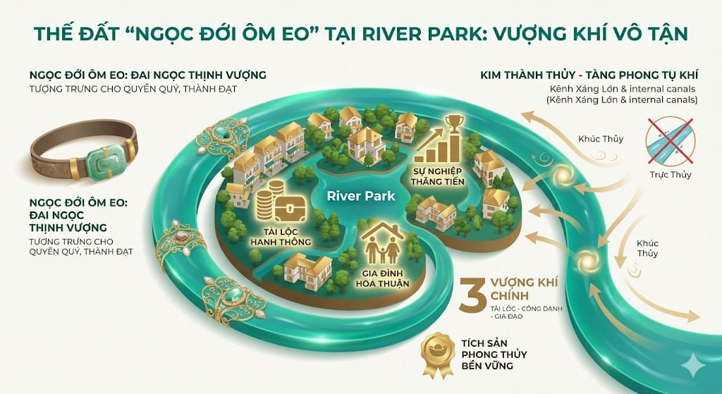 Thế đất này còn được gọi là “Kim Thành Thủy”, nơi dòng nước uốn lượn mềm mại ôm lấy khu đất, giúp tích tụ năng lượng và tài lộc. Những cư dân sống trong thế đất “Ngọc Đới Ôm Eo” thường có cuộc sống hanh thông, sự nghiệp thăng tiến và gia đình hòa thuận. Điều này giải thích vì sao các căn biệt thự ven kênh tại River Park luôn thu hút sự săn đón của giới thượng lưu.