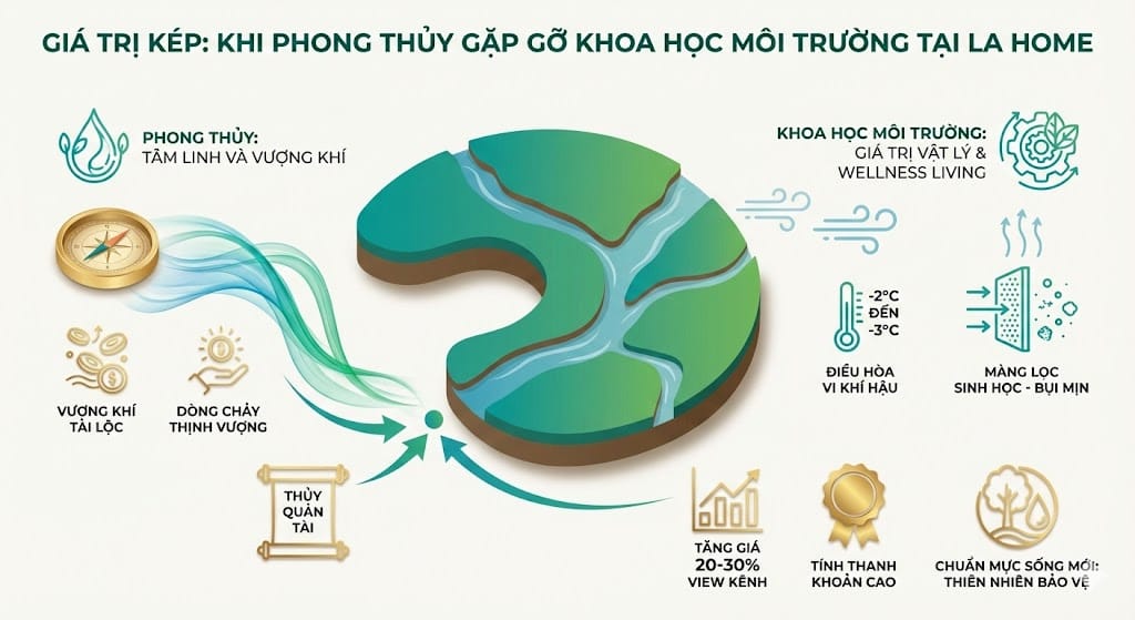 Hệ thống 7 dòng kênh đóng vai trò như một bộ máy điều hòa vi khí hậu khổng lồ cho toàn bộ 100ha dự án. Nhờ khả năng bốc hơi nước và sự lưu thông của gió từ sông lớn, nhiệt độ tại khu đô thị LA Home luôn thấp hơn khu vực xung quanh từ 2-3 độ C. Điều này đặc biệt có ý nghĩa trong bối cảnh biến đổi khí hậu và hiện tượng đảo nhiệt đô thị ngày càng nghiêm trọng.