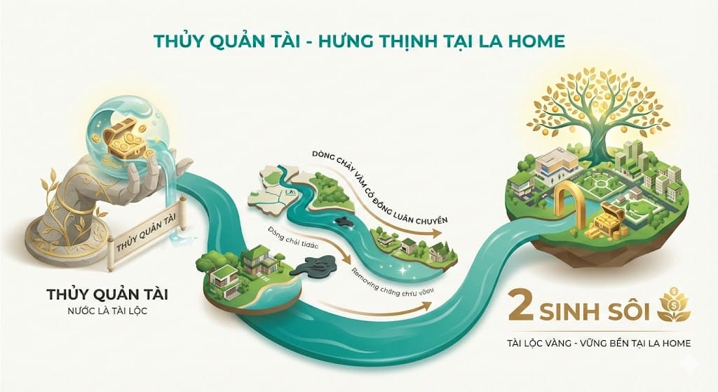 Dự án LA Home là quần thể đô thị sinh thái 100ha được xây dựng dựa trên triết lý “Thủy Quản Tài”, nhấn mạnh vai trò của dòng nước trong việc dẫn dắt tài lộc và hưng thịnh. Trong phong thủy bất động sản, nước (Thủy) không chỉ đơn thuần là yếu tố cảnh quan mà còn là huyết mạch biểu trưng cho sự lưu thông của dòng tiền và may mắn.
