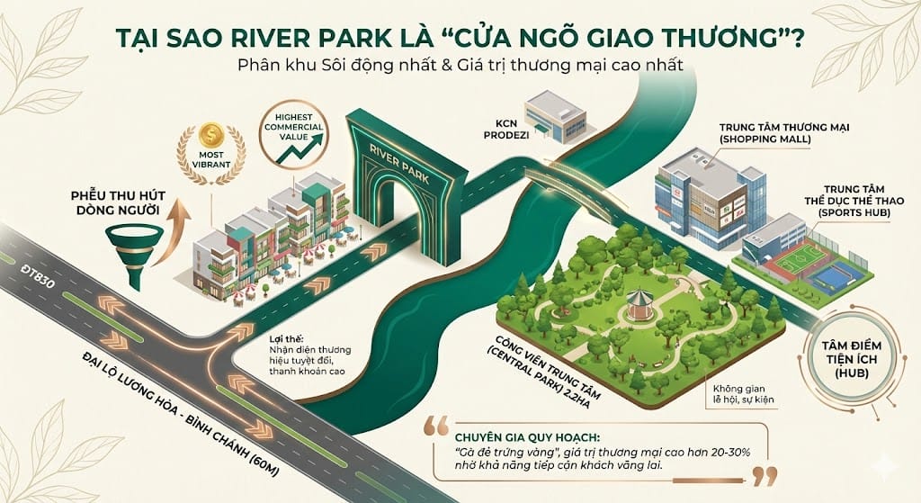 Phân khu River Park được định vị là “trái tim thương mại” sôi động nhất và sở hữu giá trị thương mại cao nhất trong tổng thể 100ha của đại đô thị LA Home. Nắm giữ vị thế “Cửa ngõ” (Gateway) chiến lược, đây là điểm tiếp cận đầu tiên của mọi luồng giao thông từ đường ĐT830 và Đại lộ Lương Hòa – Bình Chánh đi vào dự án. Bất kỳ ai muốn tiến vào trung tâm khu đô thị hay di chuyển sang Khu công nghiệp sinh thái Prodezi đối diện đều bắt buộc phải đi qua River Park.