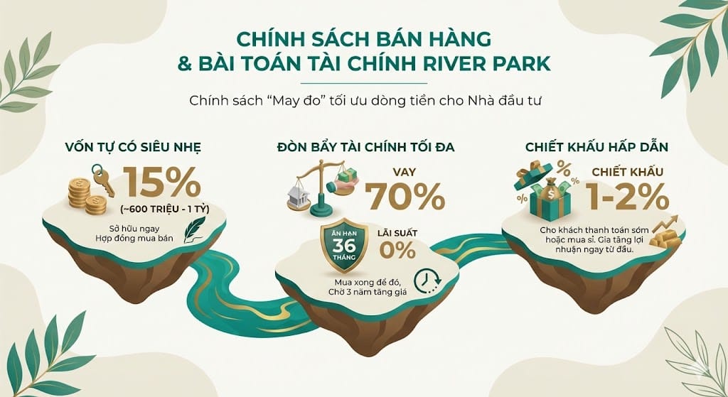 Hiện tại, River Park đang áp dụng chính sách “May đo” cực tốt, được thiết kế đặc biệt để tối ưu dòng tiền cho nhà đầu tư, nhất là khách hàng miền Bắc.