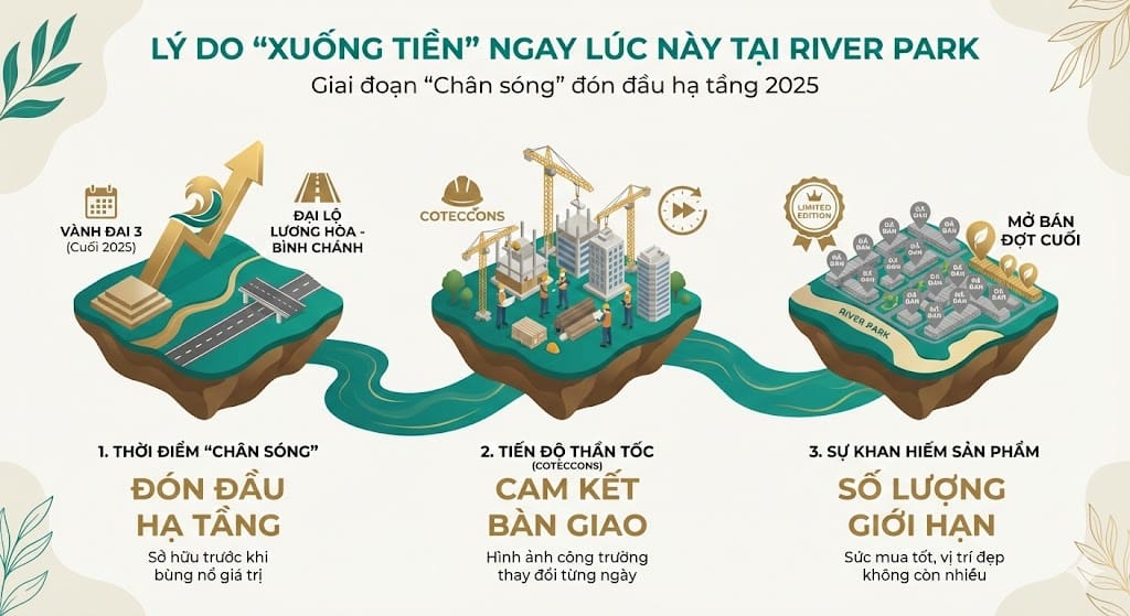 Thời điểm hiện tại là giai đoạn “chân sóng” để sở hữu sản phẩm tại River Park trước khi các cột mốc hạ tầng quan trọng được thiết lập vào cuối năm 2025.