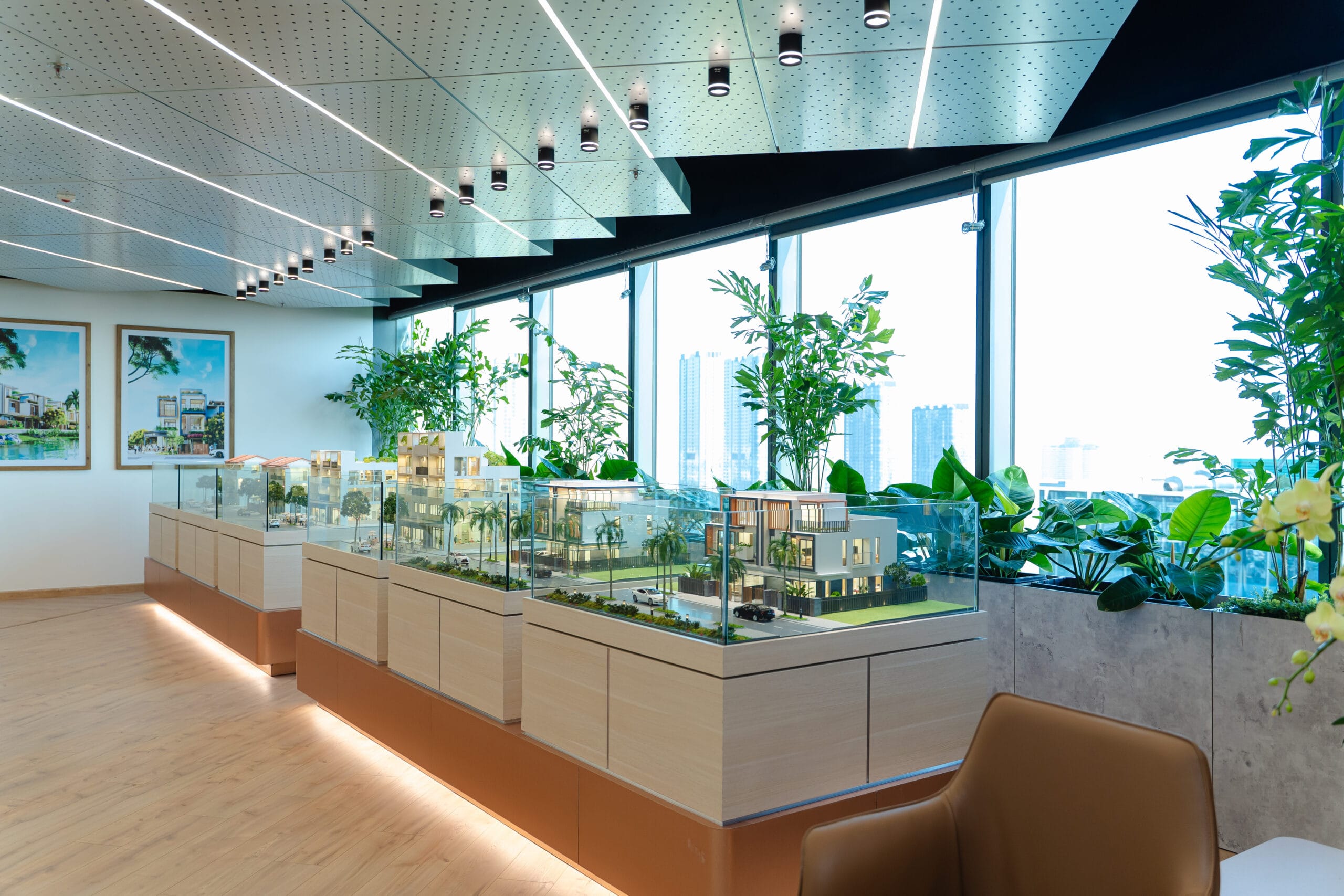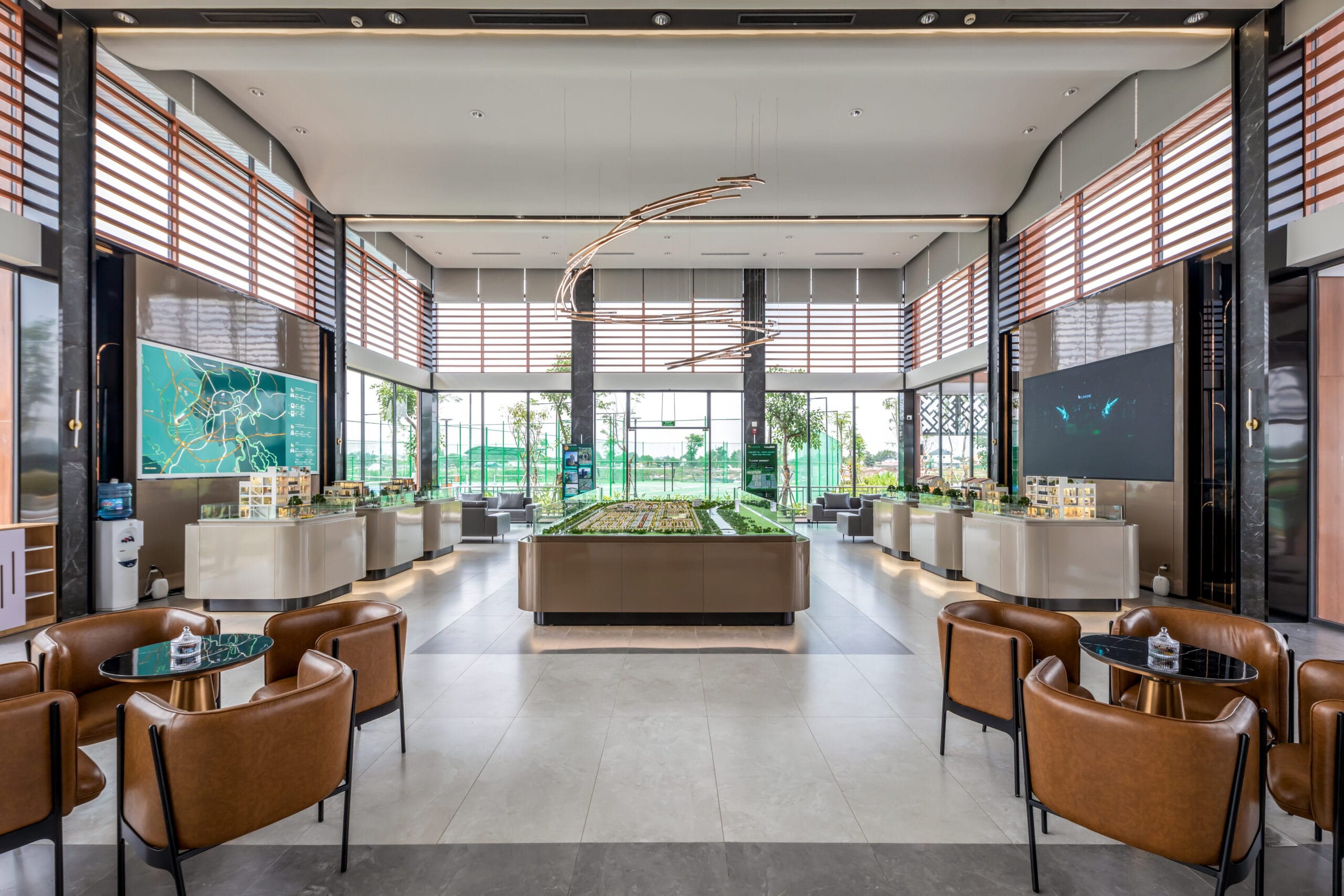 Không gian bên trong Sales Gallery được thiết kế như sảnh chờ của một khách sạn 5 sao với trần cao phóng khoáng và hệ kính panorama thu trọn cảnh quan sinh thái. Bước vào đây, cái nắng oi ả của miền Tây lập tức bị đẩy lùi, thay vào đó là cảm giác thư thái tuyệt đối với hương tinh dầu nhẹ nhàng và âm nhạc du dương.