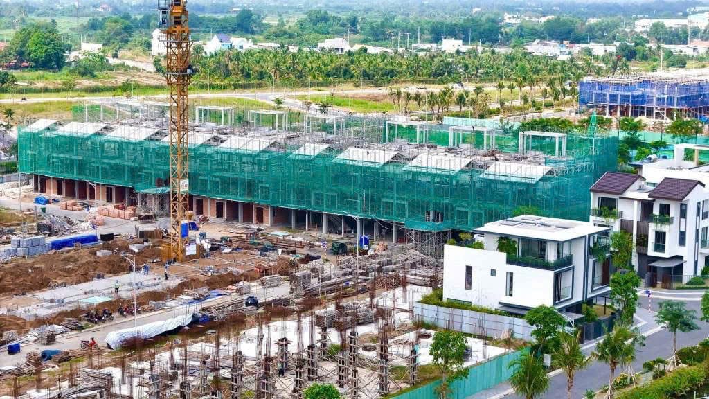 Tại phân khu LA Sol, các dãy nhà phố và shophouse đang trong quá trình xây dựng đồng bộ các hạng mục hoàn thiện. Đây là phân khu đã ghi nhận tỷ lệ hấp thụ 100% giỏ hàng trong các đợt mở bán trước đó, cho thấy sức hút mãnh liệt của sản phẩm nhà gắn liền với đất tại khu Tây.